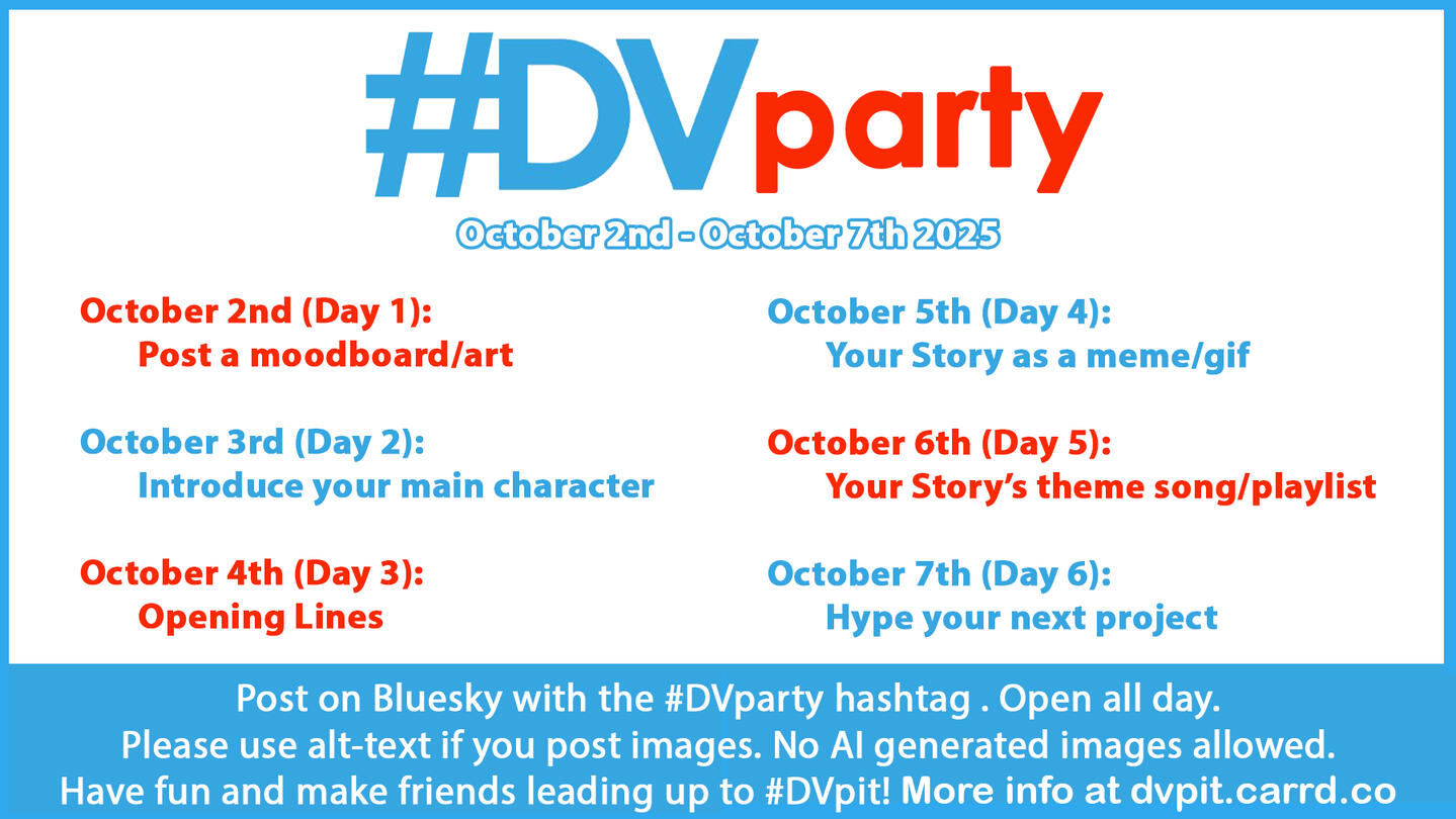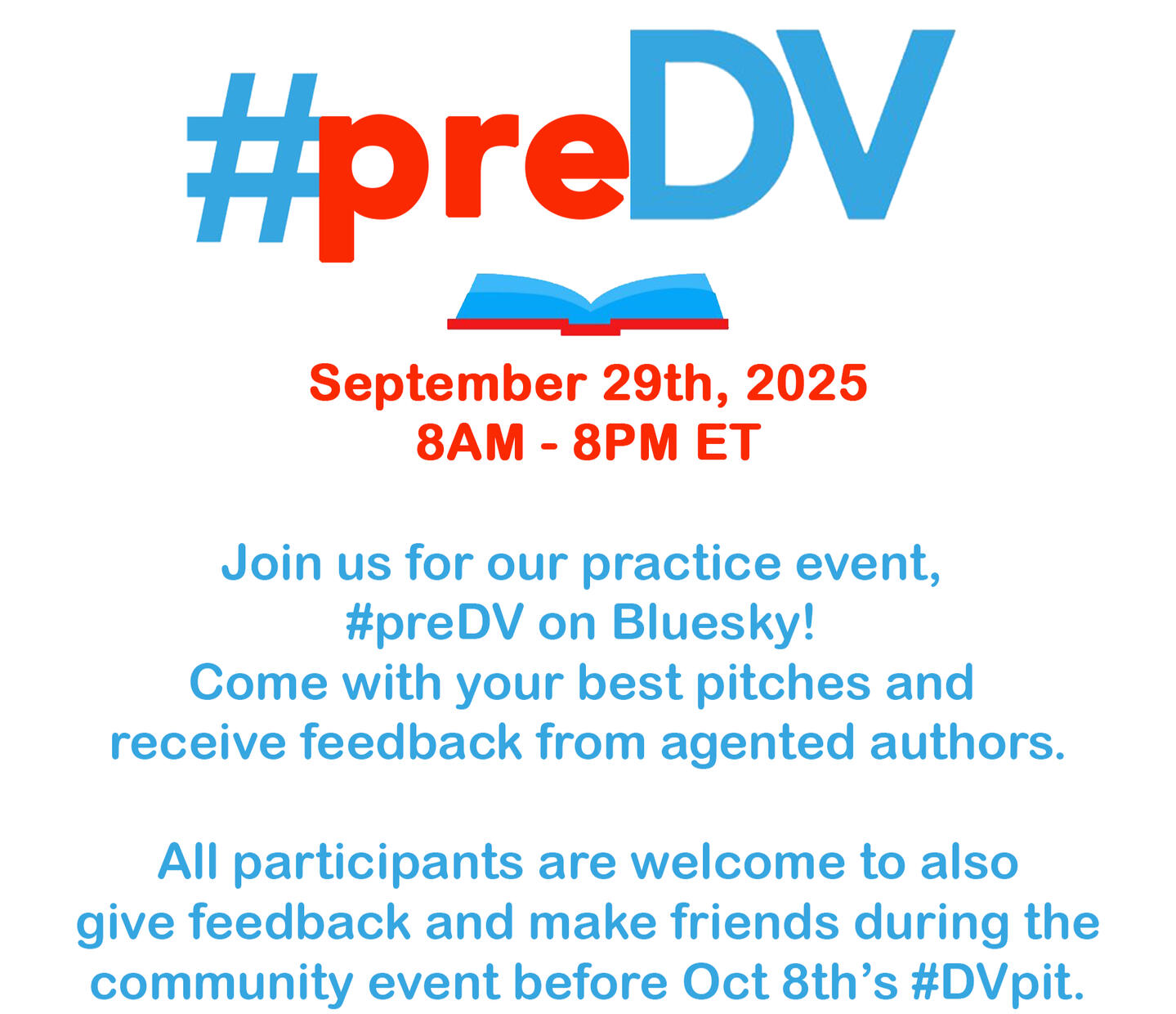On Monday, September 29th, 2025 between 8AM and 8PM ET Post your pitch as you'd post it on #DVpit to get feedback from other DVpit hopefuls as well as our agented author volunteers!Use the #preDV hashtag in lieu of #DVpit (the same amount of characters, so it should still work when you use it for the main event!)This event is more casual than the formal #DVpit, so post as many pitch attempts as you'd like as long as you do not spam the feed.